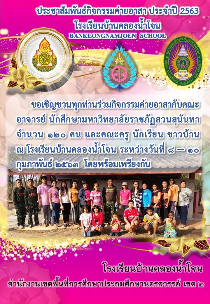 ขอเชิญชวนทุกท่านร่วมกิจกรรมค่ายอาสากับคณะอาจารย์ นักศึกษามหาวิทยาลัยราชภัฏสวนสุนันทา จำนวน ๑๒๐ คน และคณะครู นักเรียน ชาวบ้าน     ณ โรงเรียนบ้านคลองน้ำโจน ระหว่างวันที่ ๘ – ๑๐ กุมภาพันธ์ ๒๕๖๓  โดยพร้อมเพรียงกัน