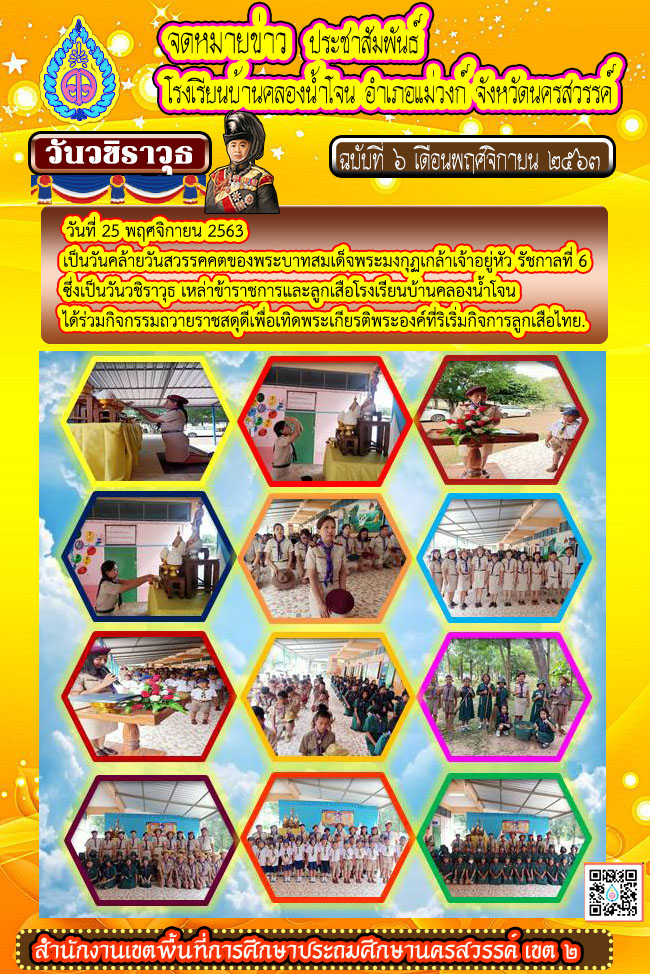 วันวชิราวุธ  เหล่าข้าราชการและลูกเสือโรงเรียนบ้านคลองน้ำโจน วันที่ 25 พฤศจิกายน ของทุกปี ตรงกับวันวชิราวุธ ซึ่งกำหนดขึ้นเพื่อเทิดพระเกียรติพระบาทสมเด็จพระมงกฎเกล้าเจ้าอยู่หัว รัชกาลที่ 6 ผู้ทรงริเริ่มกิจการลูกเสือในประเทศไทย