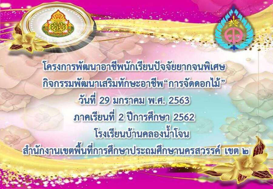 เมื่อวันที่ 29 มกราคม พ.ศ. 2563 โรงเรียนบ้านคลองน้ำโจน จัดกิจกรรมฝึกทักษะอาชีพการจัดดอกไม้ นำโดยนางศุภกานต์ พงษ์ธนภูมิ ผู้อำนวยการโรงเรียน คณะครูและนักเรียน ขอขอบคุณวิทยากร นางอภิรดี รุ่งแจ้ง นางอนงค์ทิพย์ สิงห์ศิริ และทีมงาน เป็นอย่างสูงที่มาให้ความรู้และฝึกอาชีพกับนักเรียนให้มีอาชีพติดตัวและเป็นเยาวชนที่ดีต่อไป. S:0